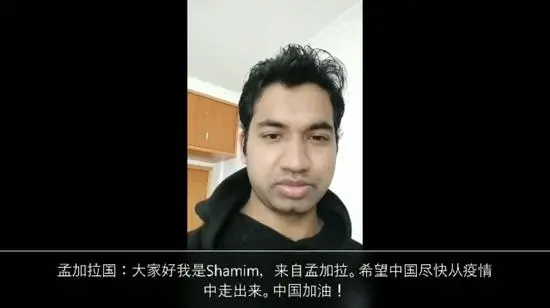 來自孟加拉國的Shamim,在浙江湖州留學和實習近一年了。對于中國奮力抗擊疫情的表現,他深受感動。日前,Shamim聯系了意大利、哈薩克斯坦、南非等12個國家的朋友,邀請他們一起錄制了一段視頻,鼓勵中國朋友們繼續堅持,戰勝疫情?!跋嘈胖袊呐笥?,看到這段視頻,會很高興。我們和他們一起加油!”他說。